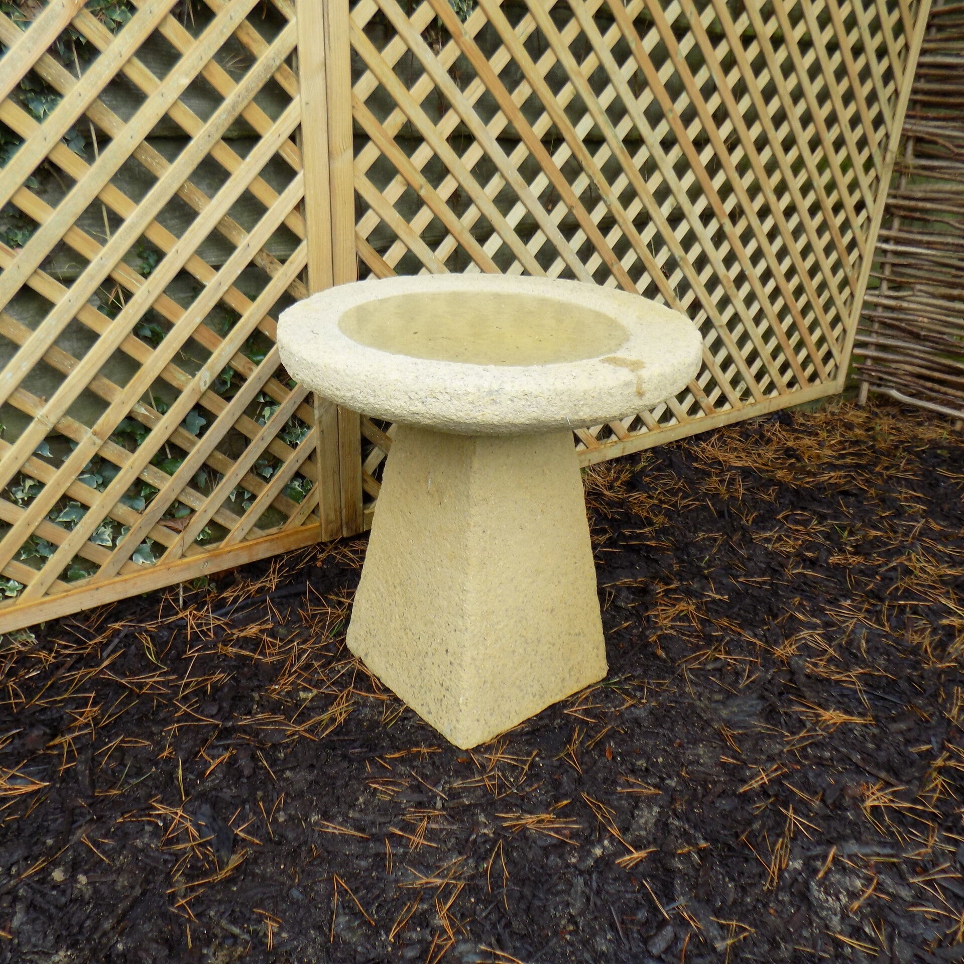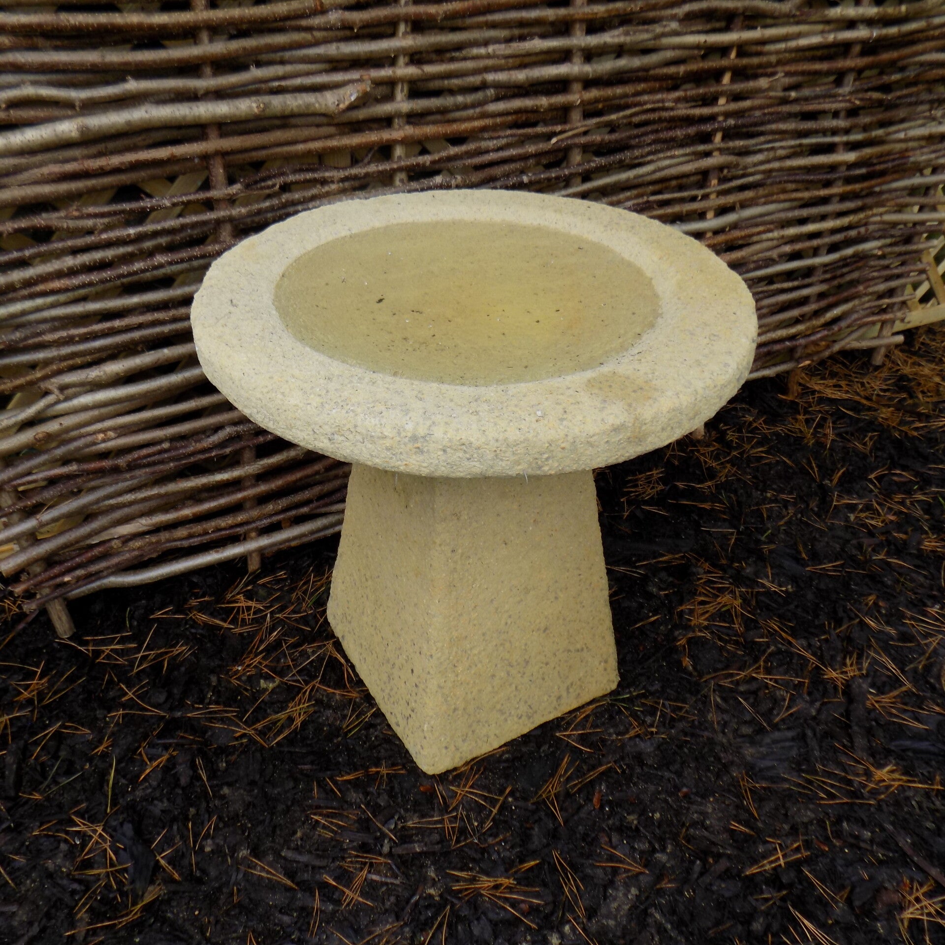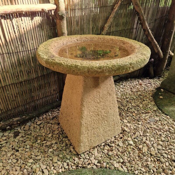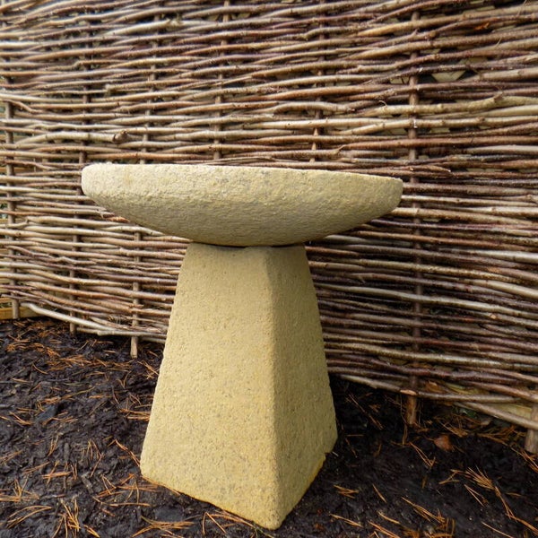This is a monster of a bird bath & and my favourite thing I make! It looks fabulous anywhere in the garden, It's a real feature piece and will hold over a Builders bucket of water. The bowl gently slopes down in a mirror of the outside, making it still suitable for all garden birds despite the extra depth in the middle. The base's top is rounded to keep the bowl in place and weights 90kg. The bowl weighs Approximately 35kg without water and is very sturdy.