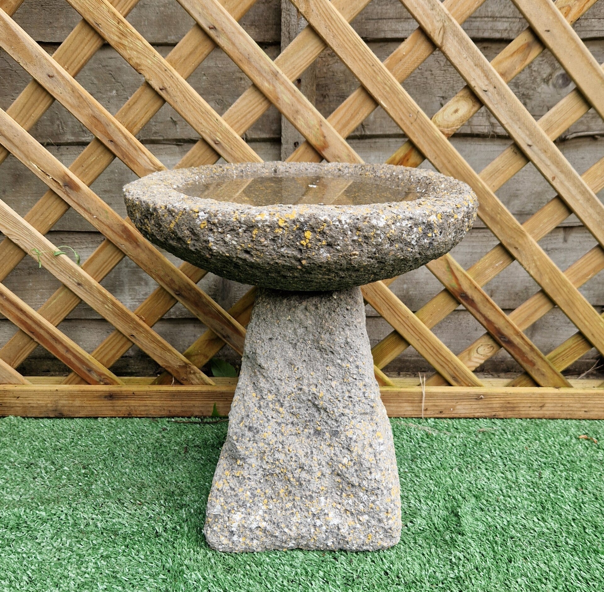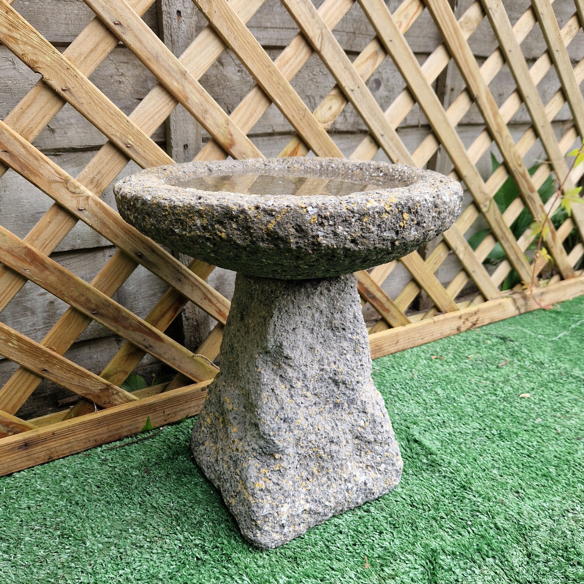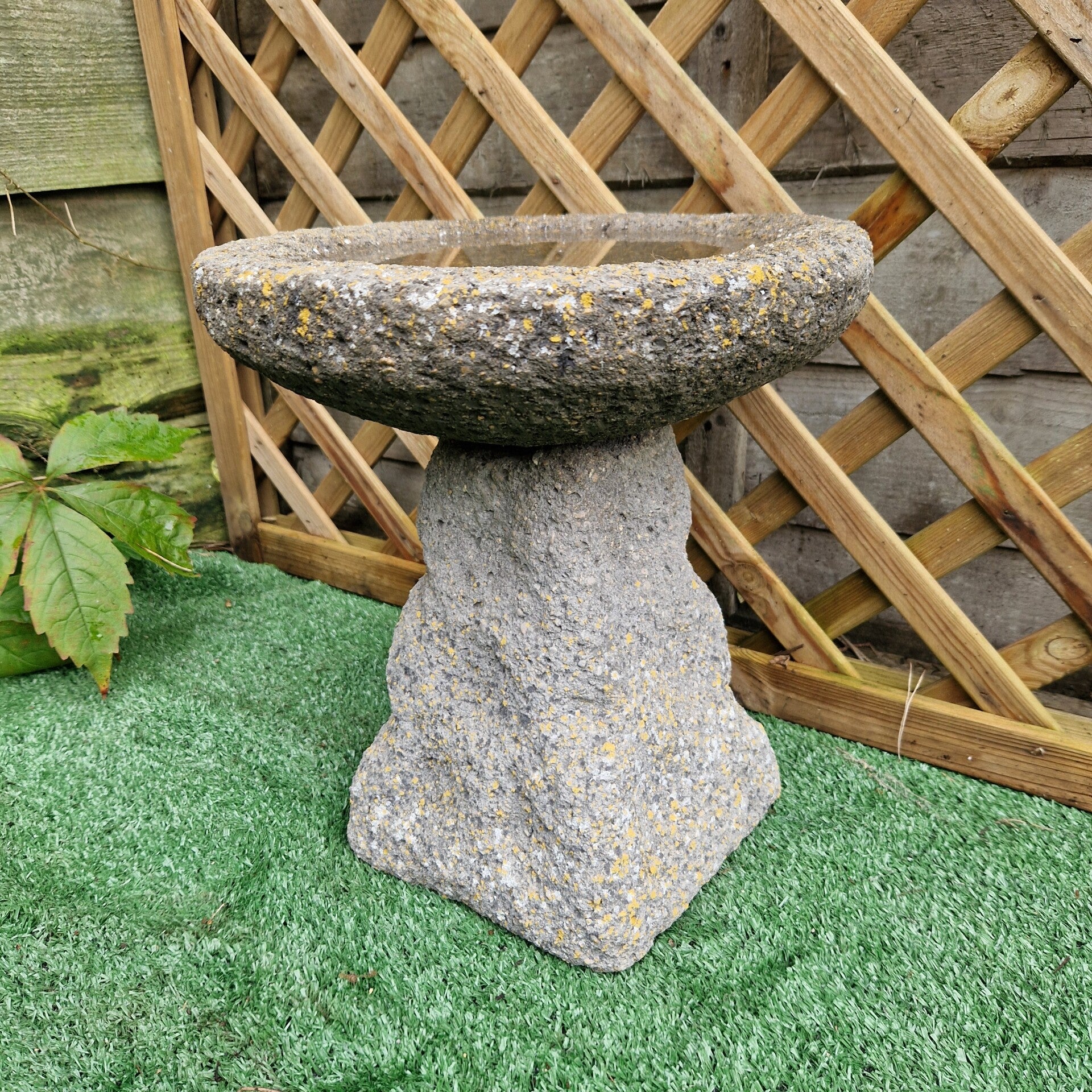 These have a beaten aged finish from day one, they really blend in against old walls and builings or in a flower bed. Its a simple but beautiful design, the bowl sits in a curve on the top of the base making it very stable. Place at the front of a flower bed near something the birds can sit in and they will soon use it readily. This is the smallest of the Staddle Stone and is very manageable weight and size.